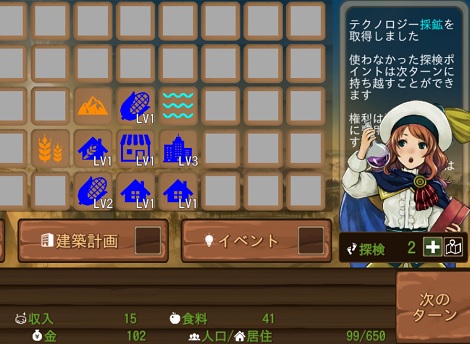 人口を増やす「スピードラン」モードか30ターンでお金をより稼ぐ「マネーウォーズ」のどちらかを選び土地とキャラを選びゲームスタート。テクノロジーから土地を探索したり、建設計画から建物を建てたり、イベントから色々な発見をしたりして自分の王国を作っていこう。