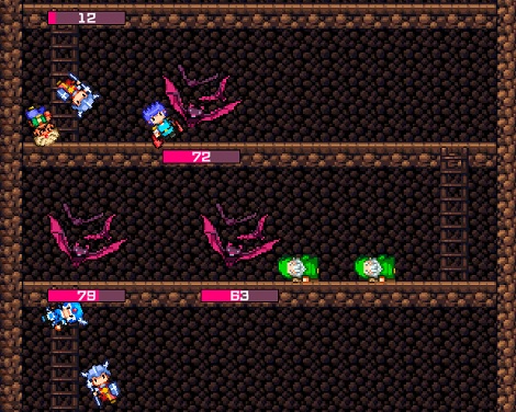 画面上にいる勇者を、マウスで飛ばす方向を決めたらクリックでショット。敵が上がって来る前に倒す事ができるとウェーブクリア。倒れている味方に当たる事ができると、仲間に加わってステータスがアップします。